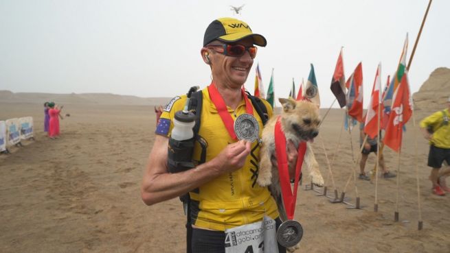 Dion Leonard ist eigentlich Einzelkämpfer. Hunderte Kilometer läuft der Extremsportler bei Rennen wie hier durch die Wüste Gobi. Doch seit dem Lauf in China ist alles anders: die zweite Hälfte der insgesamt 250 Kilometer langen Strecke lief dem Australier einfach mal diese Straßenhündin hinterher – bis ins Ziel.