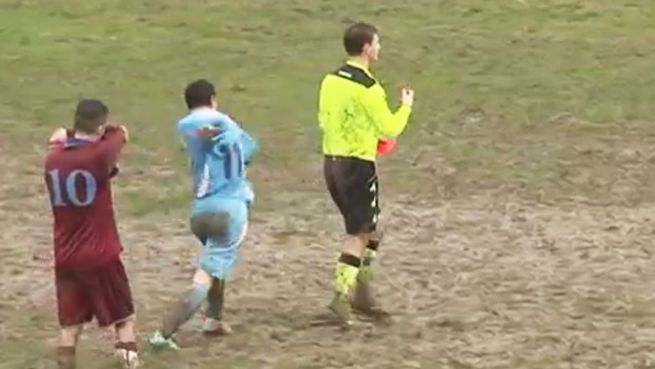 Die Niederungen des italienischen Fußballs: Nach einer roten Karte tritt ein Spieler dem Schiri brutal in die Beine. Doch der reagiert wie ein echter Übermensch – nach dem Motto: Wenn dir einer in die rechte Wade tritt, halt auch noch die linke hin.