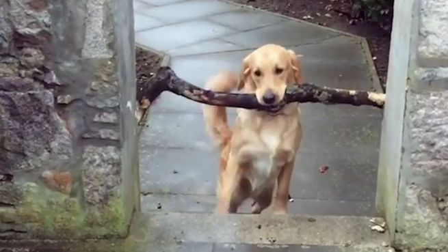 Hund Buddy kann schon gut Stöckchen holen, nur beim Bringen hapert es noch ein wenig. Mit dem Stock quer im Maul kommt er einfach nicht durch ein vermeintlich viel zu schmales Tor. Auch ein Versuch mit Anlauf hat keinen Erfolg.