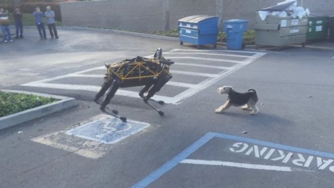 Hier treffen zwei Vierbeiner aufeinander. Der eine ist ein echter Hund, der andere jedoch der Lauf-Robotor 'Spot' aus dem Hause Boston Dynamics. Hund Fido hat jedenfalls einen neuen Spielkameraden gefunden.